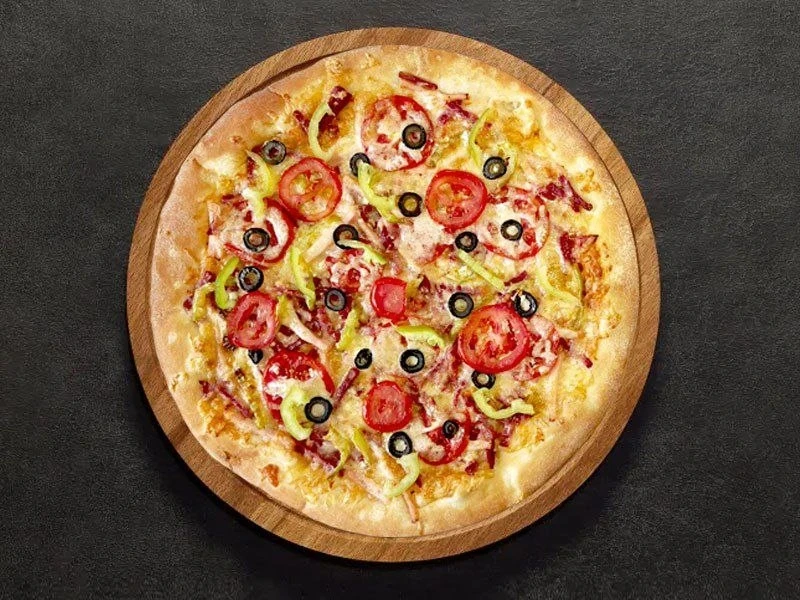 Колбаса п/к., ветчина куриная, томаты, перец болгарский, маслины, соус томатный, сыр, майонез