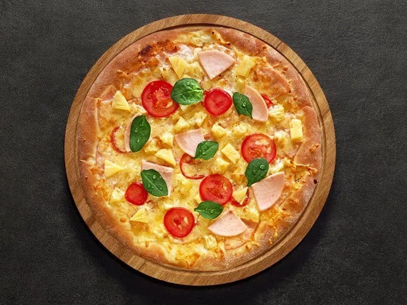 Ветчина куриная, ананас консервированный, томаты, соус томатный, сыр, майонез